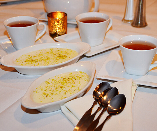 Afghan style custard, seasoned with rose water, cardamon and topped with shredded pistachio. Delicious!